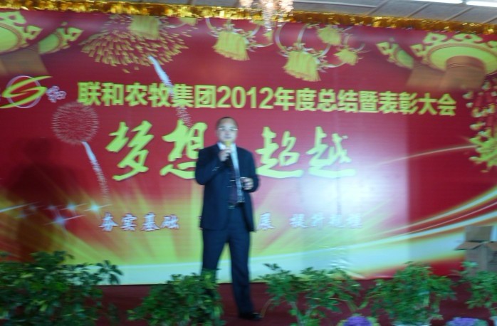 本刊訊 年終歲末,辭舊迎新。2013年元月18日,南昌翠林高爾夫酒店彩旗飄揚(yáng)、彩球高掛、張燈結(jié)彩,整個(gè)酒店洋溢著節(jié)日般喜慶的氛圍,聯(lián)和農(nóng)牧集團(tuán)2012年度總結(jié)表彰大會(huì)暨2013迎新會(huì)在此召開(kāi)。集團(tuán)總裁王曉林參加總結(jié)表彰大會(huì)并在大會(huì)上作總結(jié)發(fā)言和致祝酒詞。