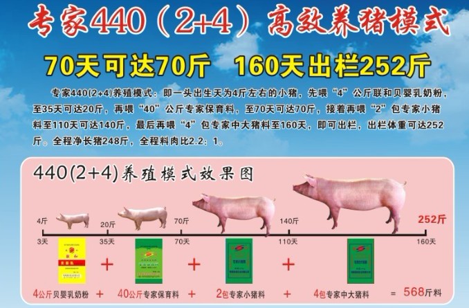 (3)聯(lián)和440(2+4)飼養(yǎng)模式只要160天豬可長(zhǎng)到252斤。全程使用專家440(2+4)飼養(yǎng)模式一頭豬可比其他飼料多賺50元錢。
