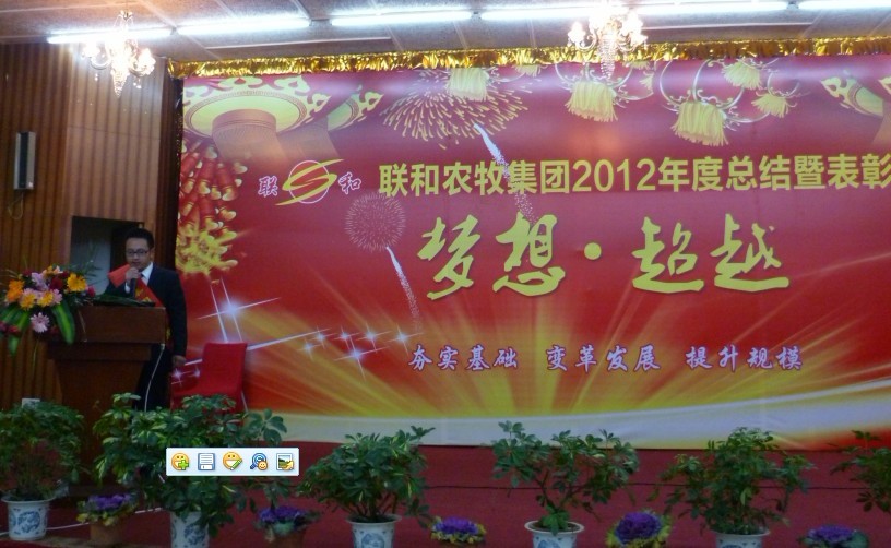 本刊訊 2013年元月18日,聯(lián)和農(nóng)牧集團(tuán)2012年度總結(jié)表彰大會在南昌翠林高爾夫酒店隆重召開。表彰獲得2012年度的集團(tuán)先進(jìn)單位、優(yōu)秀主管、優(yōu)秀員工、銷售精英等37人和2個先進(jìn)單位。來自集團(tuán)總部各部門總監(jiān)主管、新干聯(lián)和、南昌聯(lián)和實業(yè)、泰和聯(lián)和、南昌聯(lián)和飼料、贛州聯(lián)和、云南聯(lián)創(chuàng)、云南和美、貴州和美公司等銷售精英代表、優(yōu)秀主管代表、優(yōu)秀員工代表近300人。集團(tuán)總裁王曉琳參加表彰大會,并為先進(jìn)集體單位新干聯(lián)和公司、云南聯(lián)創(chuàng)公司頒發(fā)榮譽(yù)證書和獎牌。