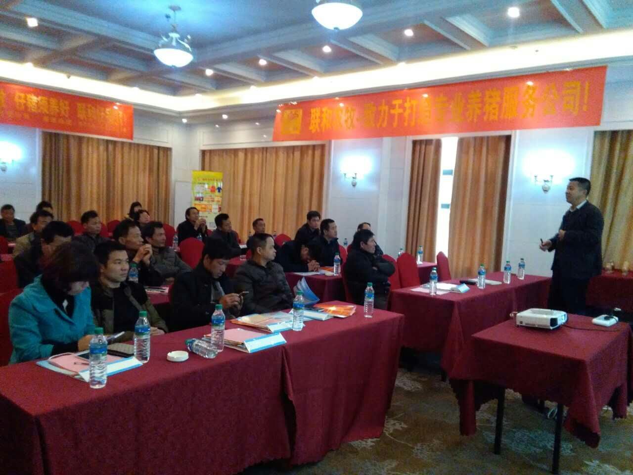 上午10:00會(huì)議正式開(kāi)始,首先由泰和聯(lián)和總經(jīng)理陳文斌上臺(tái)致歡迎詞,代表泰和聯(lián)和公司全體員工對(duì)給位老板的蒞臨表示熱烈的歡迎和誠(chéng)摯的感謝,陳總在會(huì)議上分析了當(dāng)前的大好形勢(shì),講到規(guī)模豬場(chǎng)要增效賺大錢(qián),既要加強(qiáng)豬場(chǎng)管理,又要注重飼料品質(zhì),建議大家不要一味對(duì)飼料產(chǎn)品追求價(jià)格低、政策大,因?yàn)?ldquo;羊毛出在豬身上”的道理。然后劉立茂博士為大家講解了如何提高豬場(chǎng)效益做了詳細(xì)的講解,接著由泰和聯(lián)和葉菁華老師給大家講解關(guān)于提高仔豬存活率方面的內(nèi)容,并通過(guò)圖畫(huà)生動(dòng)而易理解。會(huì)議期間不斷獲得在場(chǎng)各位老板的一陣陣掌聲,大家表示認(rèn)可公司講解豬場(chǎng)增效及提高仔豬存活率的知識(shí),并對(duì)公司的新產(chǎn)品仔豬寶有了全新的認(rèn)識(shí),對(duì)公司的產(chǎn)品的品質(zhì)充滿(mǎn)信心。