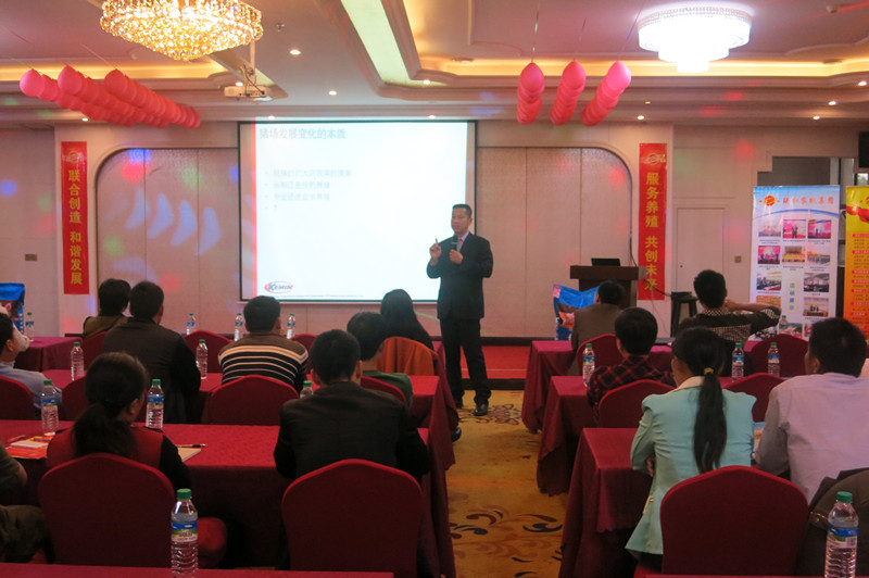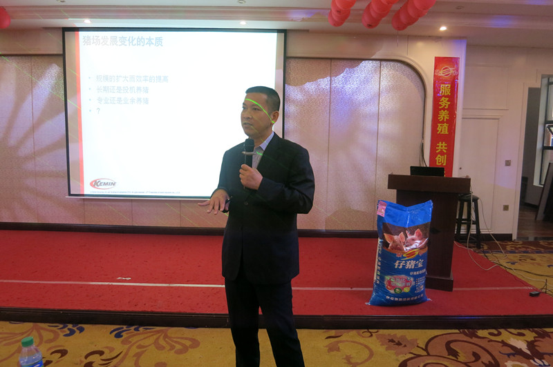 上午9點(diǎn),會(huì)議在高昂的音樂聲中隆重開幕,首先主持人邀請(qǐng)?zhí)┖吐?lián)和總經(jīng)理陳文斌上臺(tái)致歡迎辭,陳總對(duì)各位豬場(chǎng)老板的蒞臨表示熱烈的歡迎及衷心的感謝,并分析了目前的養(yǎng)殖行業(yè)情況。隨后,由劉立茂老師為大家講解關(guān)于豬場(chǎng)管理方面的內(nèi)容,劉老師以豐富的實(shí)戰(zhàn)經(jīng)驗(yàn)講到了豬場(chǎng)的一些注意細(xì)節(jié)及管理方法,贏得了各位老板的陣陣掌聲。之后,由集團(tuán)產(chǎn)品總監(jiān)劉情為大家分享講解關(guān)于聯(lián)和新產(chǎn)品--仔豬寶的品質(zhì)管理及飼喂方面的內(nèi)容,豬場(chǎng)老板對(duì)聯(lián)和仔豬寶的使用效果表示認(rèn)可。隨后,由來自吉安的王老板、周老板以及吉水的黃老板等豬場(chǎng)代表上臺(tái)與大家一起分享了使用聯(lián)和飼料的感受,三位老板紛紛表示自己使用聯(lián)和幾年來,感覺聯(lián)和飼料產(chǎn)品質(zhì)量穩(wěn)定、性價(jià)比很高,特別是仔豬寶產(chǎn)品,使用效果非常好,并表示聯(lián)和服務(wù)到位。