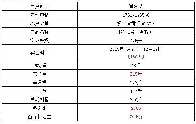 我養(yǎng)了1000來頭肥豬,從7月份開始用的聯(lián)和1號(hào)直至出欄,由于非瘟影響導(dǎo)致耽誤了賣豬,所以養(yǎng)到了315斤,全程育肥花了160天,成活率達(dá)到了99.6%。豬養(yǎng)到這么大,料肉比也才2.66,等于百斤料增重達(dá)到37.5斤,看到這個(gè)數(shù)據(jù)讓我很欣喜、很滿意。明年養(yǎng)豬,我還要用聯(lián)和飼料!