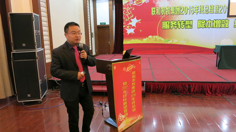 會議分為幾個環(huán)節(jié)進行,首先由集團總裁王曉林做了2016年度工作總結(jié)及2017年工作部署。王總裁指出,2016年,在大勢起伏的行業(yè)背景下,全年銷量實現(xiàn)增長28.5%,聯(lián)和農(nóng)牧集團在產(chǎn)品升級、團隊建設(shè)、項目發(fā)展等各方面都取得了長足發(fā)展。王總裁要求2017年全公司上下各部門、各公司要堅決推進落實集團戰(zhàn)略轉(zhuǎn)型目標,圍繞轉(zhuǎn)型目標做好各項工作。隨后,由集團副總裁潘澤微及云貴區(qū)總經(jīng)理曾歡水分別作了江西區(qū)及云貴區(qū)2017年工作目標及具體工作安排。來自大慧農(nóng)網(wǎng)絡(luò)科技有限公司總經(jīng)理羅孟君先生也在現(xiàn)場為大家做了轉(zhuǎn)型的服務推介。